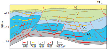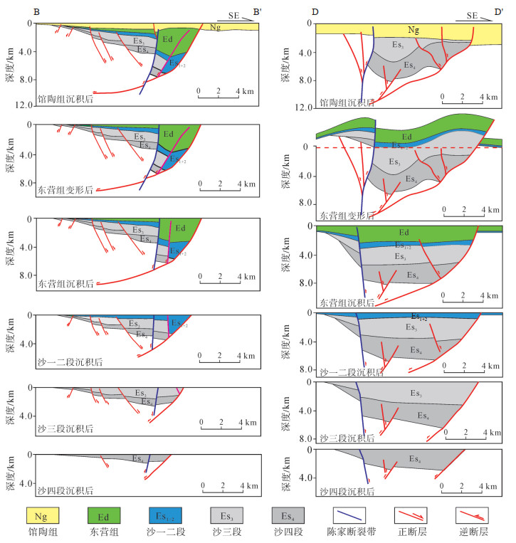 下载原图 图 9 辽河坳陷陈家断裂带构造演化剖面(剖面位置见图 1) Fig. 9 Tectonic evolution profile of of Chenjia fault zone in Liaohe Depression |