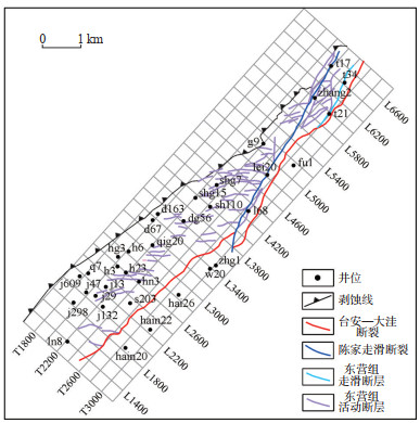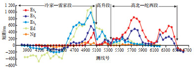 陈家断裂带是研究区内的主干断裂,它是台安—大洼断裂所派生且是该断裂的重要组成部分[12],其明显特征是与区域构造走向一致,剖面上呈“上陡下缓”的形态,其延伸长度贯穿全区,该断层南宽北窄,且是正负构造单元划分的分界断层。通过对陈家断裂断距-距离曲线的分析(图 3),可以将陈家走滑断裂划分为三段式走滑断裂系统,自南向北分别为冷家—雷家段(L3800—L5100)、高升段(L5100— L5350)与高北—坨西段(L5350—L6500)。其中,南段的冷家—雷家段主要活动时期为沙一段、沙二段和东营组,中段的高升段活动时期与冷家—雷家段相似,北段的高北—坨西段沙三段、沙四段断距大。这种变化说明陈家断裂北段在沙四段与沙三段沉积时期活动强烈,中段在沙一段与沙二段—东营组沉积时期活动强烈,南段在东营组沉积时期活动强烈,由此可见,陈家断裂活动时期自北向南依次变晚。
