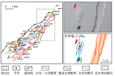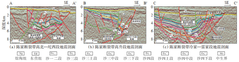 辽河西部凹陷的断裂特征主要表现为断层数量多、规模大,且发育多期多组,以张性正断裂为主,兼具走滑与反转特征[19-20],按断层的走向特征分为北东向和近东西向两大组(图 2)。研究区主要发育陈家断裂与台安—大洼断裂2条主干断裂,整体均为北东走向。