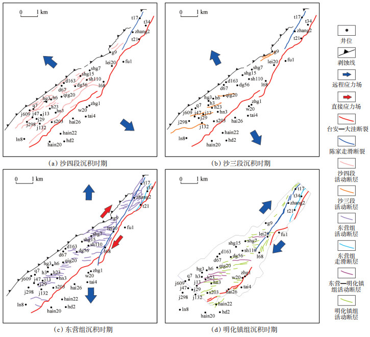 沙四段沉积时期,整体以初始伸展为主,台安—大洼断裂长期活动,同时在远离基底断层的凹陷中,新生一系列NNE向、NE向断层,这些断层反映当时的伸展应力场方向为NW向(图 5a)。