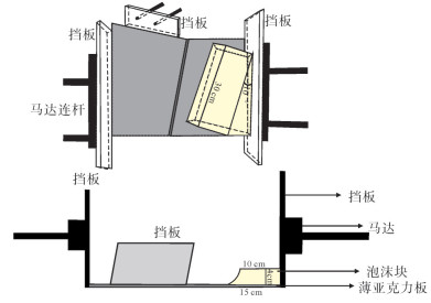 基于对陈家走滑断裂带构造样式的分析,针对走滑断裂带的形成演化过程,设计了简单的复合模型。实验砂箱规格为60 cm*40 cm*15 cm(图 6),基底铺设2片薄亚克力板,2块亚克力板斜边吻合贴齐后拉开1 cm间距,斜边与挡板夹角为10 °,左侧亚克力板与左侧固定挡板相连,右侧亚克力板固定在实验台面上,其上放置一块泡沫模型,模型直角边与右侧挡板相连,模型左侧倾角为60 °斜面,代表先存基底断裂,斜面与挡板夹角为15 °,模型高度为4 cm。左侧薄亚克力板上部边界为斜边,与挡板成70 °夹角,上部边界与一挡板相连,挡板连有一个马达,提供动力,使左侧亚克力板发生5 °斜向挤压。右侧亚克力板连接的右侧挡板也与一马达相连。