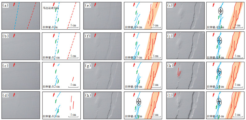 ① 当伸展位移为0.1 cm时,左侧预设走滑先存基底与右侧预设先存正断层基底之上盖层中均未变形,表明位移向上传播(图 7b)。②当伸展位移为0.2 cm时,左侧预设走滑先存基底之上形成4条小的左阶雁行断层,右侧预设先存正断层基底之上盖层形成一条沿基底走向小正断层(图 7c)。③当伸展位移为0.3 cm时,左侧预设走滑先存基底之上形成的小断层相互连接成长断裂,右侧预设先存正断层基底之上盖层中新生2条与伸展方向垂直小断裂(图 7d)。④当伸展位移分别为0.4 cm,0.5 cm时,左侧预设走滑先存基底之上新生多条左阶雁行断层,上部2条左阶雁行断裂之间均形成小隆起,右侧预设先存正断层基底之上出现2个雁列断层形成对倾的断裂带(图 7e,7f)。⑤当伸展位移分别为0.6 cm,0.7 cm与0.8 cm时,左侧预设走滑先存基底之上左阶雁行断裂延伸长度逐渐变长、隆起幅度逐渐增大,隆起上也出现小左阶雁列断裂,右侧预设先存正断层基底之上雁列式断层逐渐连接,左侧断裂带首尾连接,右侧断裂带从中部连接(图 7g—7i)。⑥当伸展位移分别为0.9 cm,1.0 cm与1.1 cm时,左侧预设走滑先存基底之上雁列断层逐渐连接形成复杂断裂带,隆起被断裂切割复杂化并被连接断裂贯穿,右侧预设先存正断层基底之上2条对倾断裂带断距逐渐增大,各自逐渐连接形成一条大断裂,中间正断层断距也逐渐增大,最后贯穿(图 7j—7l)。