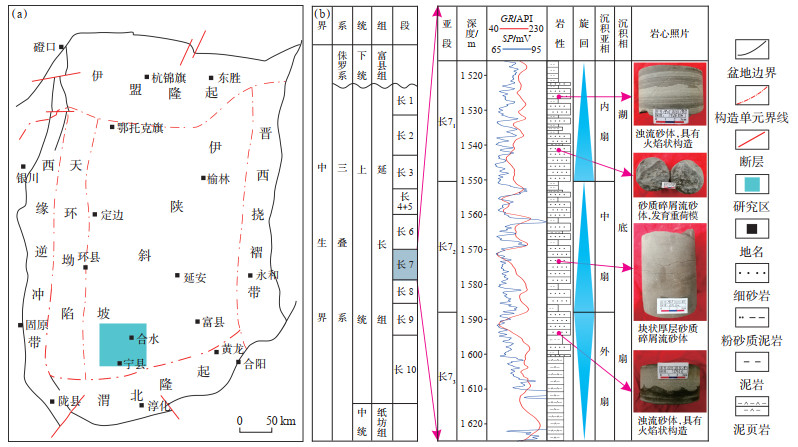 1 地质概况鄂尔多斯盆地位于华北陆块西部,是我国第二大盆地,其演化经历了中—晚元古代坳拉谷盆地发育阶段、古生代大型稳定克拉通盆地发育阶段、中生代前陆盆地发育阶段及新生代周缘断陷盆地发育阶段[21]。盆地横跨陕、甘、宁、蒙、晋五省,由伊蒙隆起、西缘逆冲带、天环坳陷、伊陕斜坡、晋西挠褶带及渭北隆起六大构造单元组成,总面积约为37×104 km2[22]。合水地区位于鄂尔多斯盆地伊陕斜坡西南部(图 1a),是长庆油田在陇东地区的重要产油基地。中生界三叠系延长组作为合水地区主要的产油层系,自下而上依次划分为长10段—长1段。其中,长7段根据旋回自下而上又可进一步细分为长73、长72与长71等3个亚段(图 1b)。作为最大湖泛期的沉降中心,合水地区长7段主要为深湖—半深湖的湖底扇沉积,可划分为内扇、中扇及外扇亚相,包括砂质碎屑流、浊流、泥质碎屑流、深湖泥等微相类型[23]。砂质碎屑流可见泥砾、泥岩撕裂屑及重荷模;浊流砂体可见鲍马序列及火焰状等重力流构造(图 1b),是区内夹层型页岩油主要的勘探目标。