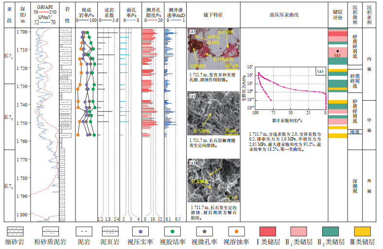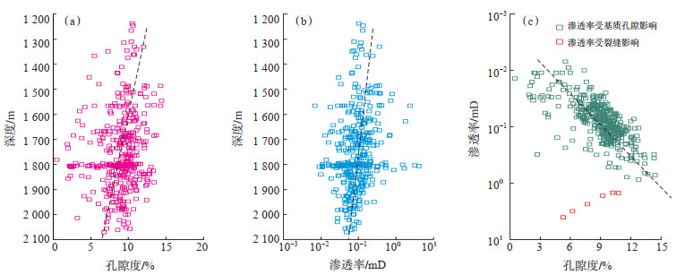 研究区长7段487个样品的物性实测统计结果表明,储层孔隙度为0.5%~14.4%,平均为8.9%,主要集中在6.0%~10.0%(占总量的64.3%);渗透率为0~4.0 mD,平均为0.2 mD,主要小于0.5 mD(占总量的97.0%)。储层孔隙度与渗透率随着埋藏深度的增大,均表现出减小的趋势(图 3a,3b),说明储层物性的变化主要受成岩作用的影响,储层埋深越大,成岩阶段越高,则物性越差。此外,储层的孔隙度与渗透率呈正相关关系,说明储层渗流能力主要受孔隙大小与其连通性的控制(图 3c)。整体上研究区储层具有高孔低渗的特征,由于长7段储层中自生黏土矿物的含量较高,且含有大量晶间微孔,虽然该部分孔隙在镜下难以观察到,但在储层总面孔率平均仅为1.9% 的情况下,其平均孔隙度却高达8.9%,说明该部分微孔隙在总孔隙体积中占比较高,但该类孔隙彼此难以连通,导致其渗透率较低。