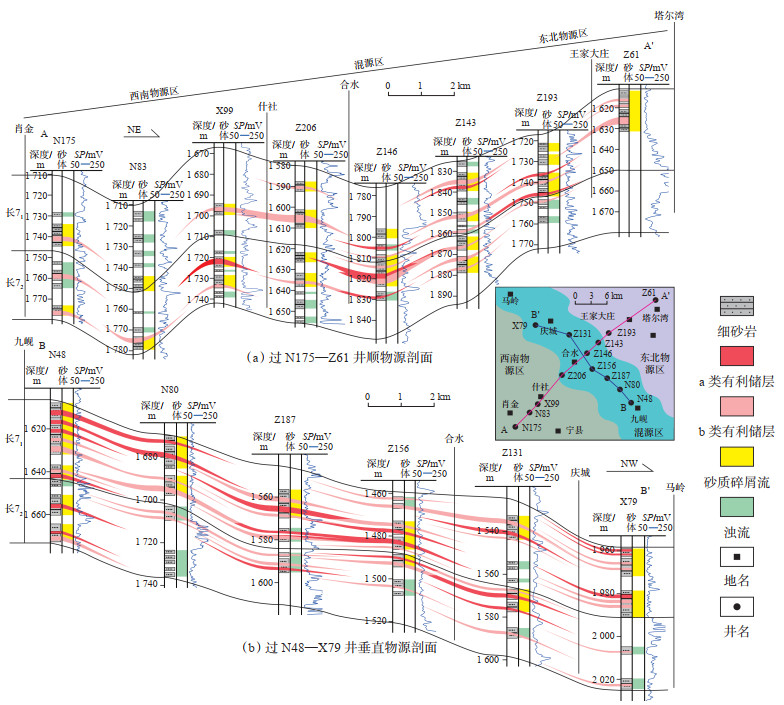 研究区储层在纵向上的分布表明一套厚层砂体内部存在多种类型的储层(图 10),厚层砂体的分布并不代表有利储层的分布,在平面上以砂体厚度分布难以预测有利储层分布。因此,以单井为单位对储层进行解剖后,经过连井剖面分析来研究有利储层的分布。从研究区西南—东北向的肖金—合水—塔尔湾一线顺物源剖面可知,有利储层主要位于研究区中部的合水一带。长8—长6段沉积期,主要存在西南部东祁连—秦岭及东北部阴山两大物源体系,从长8沉积期到长6沉积期,西南物源对研究区的影响程度逐渐减弱,东北物源对研究区的影响程度逐渐加强,长7段沉积期为过渡时期[36]。研究区西南部主要受西南物源影响,为西南物源区;东北部主要受东北物源影响,为东北物源区;中部地区则为两大物源交汇之处,为混源区。相较西南物源区与东北物源区,混源区有利储层更为发育(图 11a)。在此基础上,对研究区东南—西北向九岘—合水—马岭一线的过混源区剖面(垂直物源)研究可知,混源区有利储层纵向上叠置厚度大、沉积期次多、连通性强,具有良好的发育规模(图 11b)。