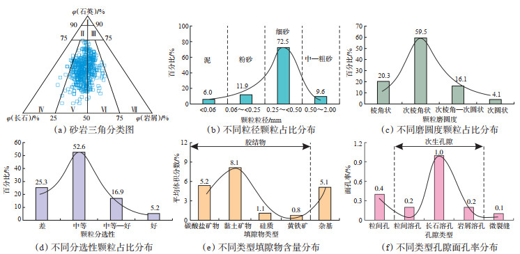 合水地区长7段530个样品的铸体薄片镜下鉴定结果显示,砂岩组分中石英平均体积分数为37.8%,岩屑平均体积分数为20.7%,以变质岩岩屑和沉积岩岩屑为主(平均体积分数分别为9.0% 与8.5%),长石平均体积分数为19.3%。根据以往学者对砂岩类型的划分[24],长7段储层岩性主要为岩屑长石砂岩与长石岩屑砂岩(图 2a)。砂岩颗粒粒径主要为细粒,磨圆度主要为棱角状,分选性主要为中等(图 2b—2d)。砂岩中填隙物包括碳酸盐矿物、自生黏土矿物、硅质胶结物、黄铁矿与泥质杂基,以自生黏土矿物为主(图 2e)。砂岩的孔隙直径大多数小于60 μm,基本无大于120 μm的孔隙发育;喉道宽度大多数小于10 μm,基本无大于25 μm的喉道发育。孔隙类型以次生溶孔为主,包括长石溶孔、粒间溶孔与岩屑溶孔,粒间孔与微裂隙面孔率较低,平均面孔率为1.9%(图 2f)。综上所述,研究区长7段储层具有成熟度低、填隙物类型多样及含量高、孔喉空间小、面孔率低等特征。