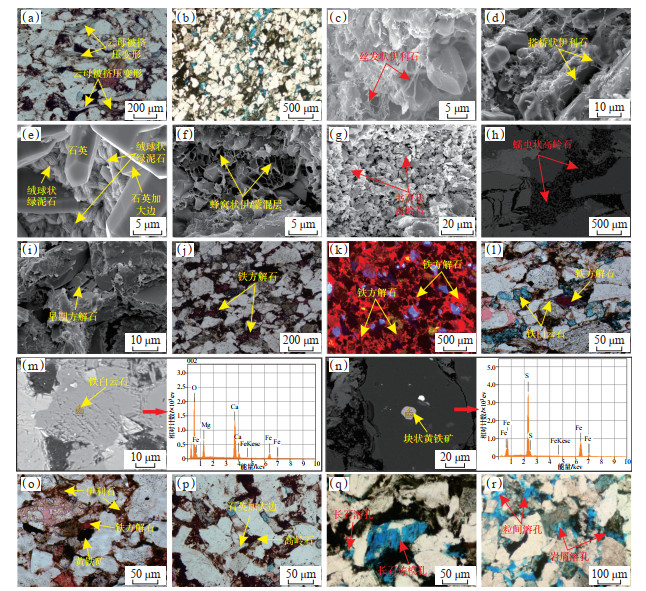 碳酸盐矿物的含量(平均体积分数为5.2%)仅次于自生黏土矿物。主要为铁方解石(平均体积分数为2.8%)与铁白云石(平均体积分数为2.0%),其次为少量的方解石(平均体积分数为0.3%)与白云石(平均体积分数为0.1%)。早期方解石一般形成于大规模压实作用之前,是长7段储层中形成最早的胶结物(图 4i),随着成岩作用的进行,方解石逐渐向铁方解石转变(图 4j);阴极发光下也可见铁方解石发橘红色光,胶结次生孔隙(图 4k)。储层中白云石已基本向铁白云石转化,以胶结次生溶孔及交代铁方解石的形式产出(图 4l);电子探针中也可见马鞍状铁白云石充填次生孔隙(图 4m),表明铁方解石与铁白云石均形成于溶蚀作用之后的成岩作用晚期,铁白云石的形成晚于铁方解石。