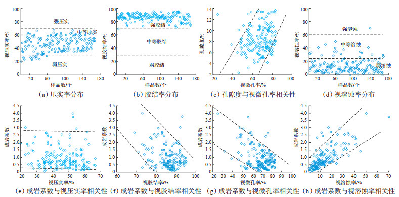 成岩系数是代表成岩作用强度的综合定量化参数,成岩系数越大,破坏性成岩作用的强度就越小,储层质量则越好;反之,其破坏性成岩作用强度越大,储层质量就越差[35]。样品计算结果表明,研究区长7段储层成岩系数为0.1~4.0,平均为0.9,储层成岩系数差异较大,破坏性成岩作用强度不等,非均质性强。研究表明,视压实率与成岩系数基本无相关性(图 5e);视胶结率与视微孔率随着成岩系数的增大而降低(图 5f,5g),视溶蚀率随着成岩系数的增大而增大(图 5h),相关性均较好。说明压实作用对储层致密化的影响程度较低,胶结与溶蚀作用分别是增强与降低储层致密化的主要成岩作用类型,为主控因素。