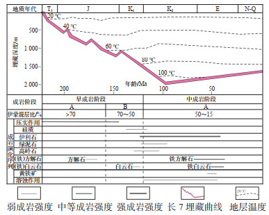 下载原图 图 6 鄂尔多斯盆地合水地区三叠系长7段夹层型页岩油储层埋藏-成岩演化模式(埋藏热史图据参考文献[16]修改) Fig. 6 Burial-diagenetic evolution process of interbedded shale oil reservoirs of Triassic Chang 7 member in Heshui area, Ordos Basin |