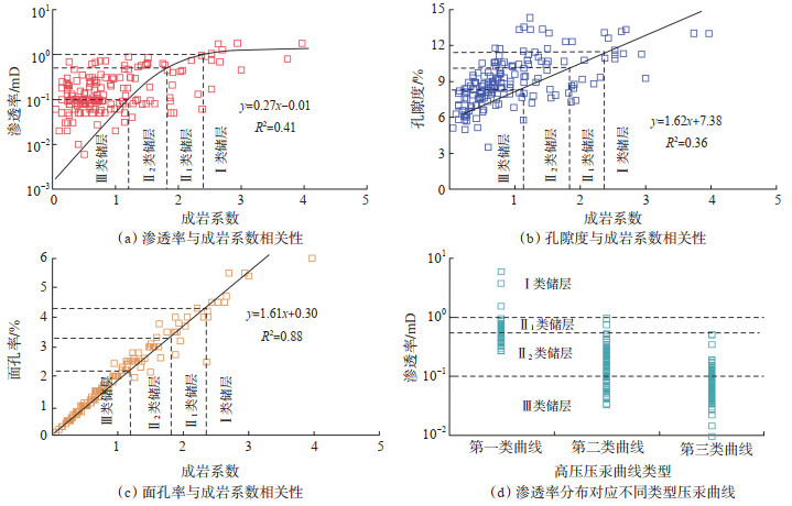 通过分析渗透率与成岩系数的相关性来确定4类储层成岩系数的分布范围。结果表明,成岩系数与渗透率呈正相关关系(相关系数为0.41),成岩系数越大,破坏性成岩作用就越弱,储层的渗流能力越强。通过相关性曲线可知,Ⅰ类储层成岩系数大于2.4,Ⅱ1类储层成岩系数为1.8~2.4,Ⅱ2类储层成岩系数为1.2~ < 1.8,Ⅲ类储层成岩系数小于1.2(图 7a)。