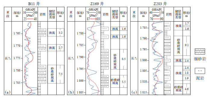 以往研究表明,砂质碎屑流与浊流微相具有一定差异,砂质碎屑流一般以块状厚层连续沉积为主,泥质含量较低,测井相多为箱形;浊流一般以砂泥互层沉积为主,泥质含量较高,测井相以钟形及指状为主[14](图 8)。结合岩心相、测井相、测井解释综合成果等数据,通过统计研究区56口井长7段中砂质碎屑流及浊流微相砂体的厚度,研究了4类储层主要的微相组合类型。结果表明,长7段中连续沉积(中间无隔层)的砂体厚度为0.2~9.6 m(平均为2.8 m)。砂质碎屑流微相砂体厚度为1.5~9.6 m(平均为4.1 m),大于3.0 m的砂体居多;浊流微相砂体厚度为0.2~5.3 m(平均为1.2 m),小于3.0 m的砂体居多。可近似将连续沉积厚度3.0 m作为判断砂质碎屑流与浊流微相的标志。