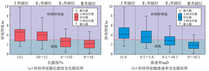 4类储层物性与连续沉积砂体厚度的相关性表明:Ⅰ类储层以砂质碎屑流微相为主;Ⅱ1类储层以砂质碎屑流微相为主,其次为少量浊流微相;Ⅱ2类储层以浊流微相为主,其次为少量砂质碎屑流微相;Ⅲ类储层以浊流微相为主(图 9)。从内扇到外扇,微相类型由砂质碎屑流向浊流转化,砂体厚度减小,隔夹层发育及泥质含量增高,储层的质量逐渐变差。