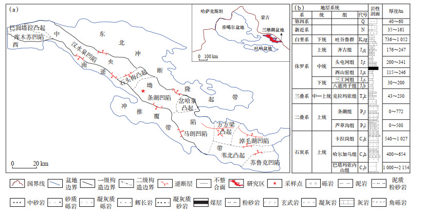 1 地质概况三塘湖盆地位于新疆巴里坤哈萨克自治县与伊吾县境内,哈萨克斯坦板块边缘,紧靠哈萨克斯坦板块与西伯利亚板块拼接处,东西长约500 km,南北宽40~70 km,面积约为2.3×104 km2,属于聚煤盆地,呈北西—南东向条带状分布。经过海西、印支、燕山、喜山等多期构造运动的复合作用,盆地发育东北冲断隆起带、中央坳陷带和西南逆冲推覆带3个一级构造单元,其中中央凹陷带自东向西依次划分为苏鲁克凹陷、苇北凸起、淖毛湖凹陷、方方梁凸起、马朗凹陷、岔哈泉凸起、条湖凹陷、石头梅凸起、汉水泉凹陷、库木苏凹陷和巴润塔拉凸起等11个二级构造单元(图 1a)[17]。
