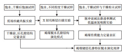 2 分析测试方法本文设计了低场核磁共振(Nuclear Magnetic Resonance,NMR)、X射线断层扫描、脉冲法渗透率测定及低温液氮吸附实验3个测试方法,分别对三塘湖盆地西山窑组褐煤试样干燥前后的孔隙结构,脱水孔隙结构演化模式及传质能力进行分析,进而分析褐煤试样的孔渗特征脱水演化规律,流程如 图 2所示。