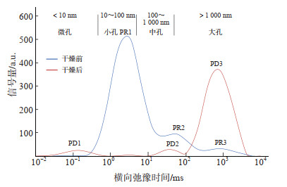 3 褐煤干燥前后孔隙结构特征NMR实验测试褐煤样品在饱水状态下的横向弛豫时间谱呈三峰分布,峰值分别出现在3.00 ms(PR1),50.00 ms(PR2),800.00 ms(PR3)位置(图 3)。根据弛豫时间与孔隙半径的定量关系可确定煤样的孔径分布: