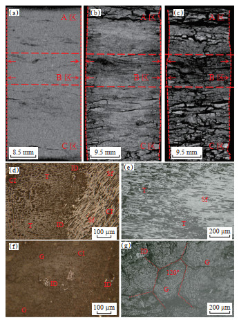 注:ID. 碎屑惰质体;Cl. 黏土矿物;F. 丝质体;Sf. 半丝质体;G. 凝胶腐植体;T. 结构腐植体;D. 碎屑腐植体。 (a)饱水样,CT扫描图像;(b)部分干燥试样,含水饱和度59%,见少量干燥裂缝分布于试样两端,A区和C区煤基质强收缩,B区煤基质弱收缩,CT扫描图像;(c)完全干燥试样,A区和C区煤基质强收缩,B区煤基质弱收缩,裂隙向试样内部扩展,CT扫描图像;(d)图(a)中B区取样光片,木质煤,见大量胞腔孔,显微镜下图像;(e)图(c)中B区取样光片,木质煤,见大量胞腔孔,显微镜下图像;(f)图(a)中C区取样光片,基质煤,凝胶化作用显著,细胞壁膨胀加厚,植物组织结构不可见,显微镜下图像;(g)图(c)中C区取样光片,木质煤,见大量干燥裂隙,显微镜下图像。 Fig. 5 CT scanning and microscope observation images of lignite samples with different drying degrees of Jurassic Xishanyao Formation in Santanghu Basin before and after drying |