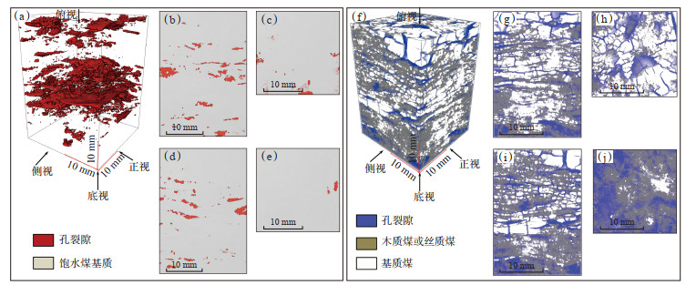进一步对比饱水、干燥试样的数字岩心发现,饱水试样中仅提取到少量原生裂隙,且显微组分类型难以区分,分析认为这是由于含水孔隙均匀分布在煤基质中,平衡了不同组分间的密度差异,导致X-CT的分辨能力降低;干燥试样中可观察到大量裂隙发育在亮部(脱水收缩后密度增加的基质煤)边缘或内部,孔隙则主要分布在暗部(密度降低的基质煤)区域(图 6)。