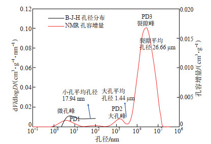 将干燥褐煤试样的B-J-H孔径分布曲线与核磁共振孔容分布曲线进行对比可知,B-J-H孔径分布曲线上微孔峰孔径为4 nm,与核磁测得PD1峰(位置为3 nm)对应,但PD1峰略左偏,分析认为这可能是由表面弛豫率取值误差导致(图 8)。