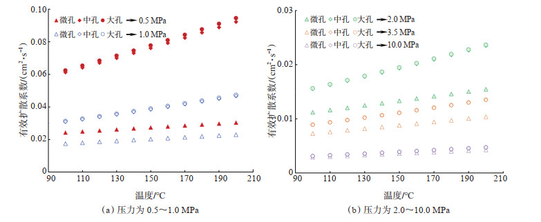 小孔平均孔径通过B-E-T模型计算为17.94 nm,大孔与裂隙的平均孔径由核磁中值孔径代替,分别为1.44 μm和26.66 μm(图 8)。为评估不同注气压力下干燥区煤样的扩散性,计算温度为100~200 ℃、压力分别为0.5 MPa,1.0 MPa,2.0 MPa,3.5 MPa和10.0 MPa时的扩散系数。结果(图 9)表明:①煤样中水分向气化反应前沿的扩散传质主要发生在大孔及裂隙内,如在压力为0.5 MPa、温度为200 ℃时,裂隙与大孔的扩散系数分别为0.095 cm2/s和0.092 cm2/s,远大于微孔扩散系数0.03 cm2/s;②随压力增加,不同尺寸孔隙的传质能力差异变小,同时煤样扩散传质能力显著降低,如在压力为10.0 MPa、温度为200 ℃时,微孔、大孔及裂隙的扩散系数分别为0.004 3 cm2/s,0.004 7 cm2/s,0.004 7 cm2/s,数值较接近,但值较小。因此,气化腔在低压运行过程中,水分由原煤区(干燥区)向氧化区传输较快,煤样中的水可以作为还原剂降低反应前沿的温度,并增加有效气体产率;在高压运行过程中,气化腔与地层压差导致原煤区水分远离空腔渗流,干燥区水蒸气向反应前沿扩散传质较慢,煤样中的水难以被利用,应适当注入还原剂以改善产气效果。