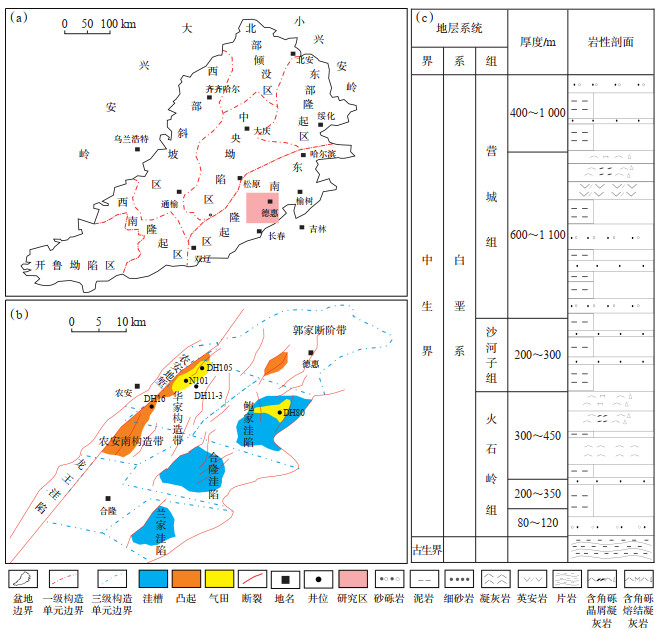 下载原图 图 1 松辽盆地德惠断陷构造位置(a)、白垩系构造单元(b)及岩性地层综合柱状图(c) Fig. 1 Structural location (a), Cretaceous tectonic unit (b) and stratigraphic column (c) of Dehui fault depression, Songliao Basin |