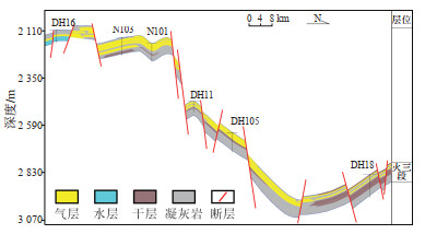 通过对华家构造带已开发气藏的精细分析(图 10),发现该套气藏具有两大特征:一是受火石岭组、营城组和嫩江组沉积末期的多期构造运动影响,地层破碎,断裂复杂致使气藏分散,整体表现为构造背景下的低压、低饱和度的岩性气藏;二是优质气层总体位于中上部,由于源储配置不同,不同断块气层分布具有差异,总体表现为空间不连续的特征,局部“甜点”区可效益动用。综上分析可知,德惠断陷火石岭组凝灰岩成藏条件相对有利,气藏具有源储侧向对接和构造高位富集的特性。结合气藏和已钻井揭示认为,研究区凝灰岩成藏主要受构造、断裂、供烃窗口控制,其中构造控制了油气富集,断裂及供烃窗口的大小决定了气藏规模。