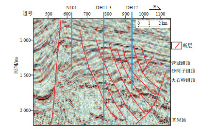 下载原图 图 11 松辽盆地德惠断陷华家构造带白垩系N103-DH11-3-DH12井地震剖面 Fig. 11 Seismic section of Cretaceous across wells N103-DH11-3-DH12 in Huajia structural belt of Dehui fault depression, Songliao Basin |