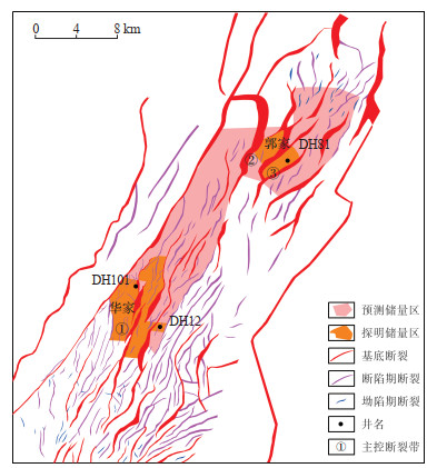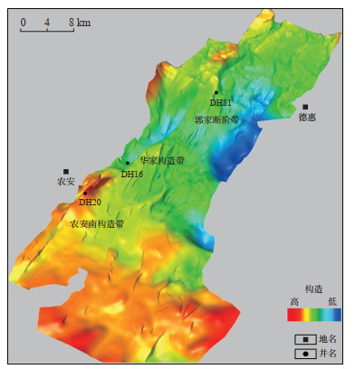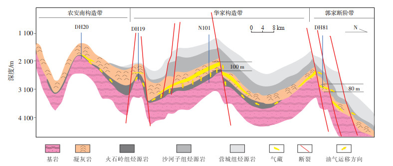 受多期构造运动影响,德惠断陷整体表现为“西高东低,南高北低”的构造格局(图 12)。农安南构造带构造样式为断鼻、断块,其与火石岭组烃源岩侧向对接,高部位的断鼻、断块对成藏有利。华家构造带具有鼻状构造特征,其与烃源岩侧向对接,同时通过小断裂垂向沟通火石岭组和沙河子组烃源岩,其高部位断块是有利成藏区。郭家断阶带构造样式为顺向断阶,主要与沙河子组烃源岩形成垂向输导的关系,辅以与营城组烃源岩侧向对接,断阶高部位断块对成藏有利。综上可知,构造活动控制了气藏分布[21],构造高部位为油气主要富集区。