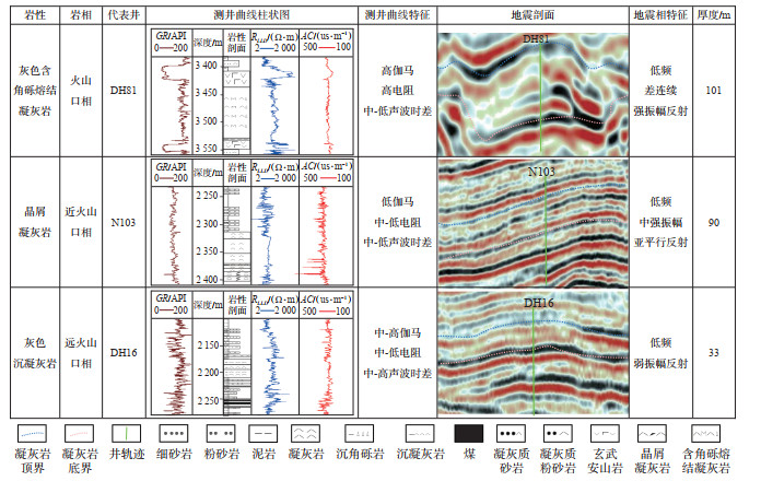 王璞珺等[11]按照岩石结构对火山岩进行分类,将凝灰岩归结为火山碎屑岩,属于火山岩的一种。已开发的火山岩气藏显示,火山岩气藏具有分布广、厚度大、物性好、源储匹配好的特征,其储层往往由多期火山喷发叠置而成,因风化剥蚀作用,每期火山岩顶部储层发育,其物性受岩性、岩相控制作用明显[12]。德惠断陷形成于古生代,是多期构造运动的产物。从二叠纪开始到早侏罗纪,受印支运动和燕山运动第Ⅰ幕影响,遭受强烈的挤压,导致广泛的变质作用和岩浆活动,使盆地整体抬升,遭受风化剥蚀;至中生代晚侏罗纪开始裂陷活动,到了白垩纪早期,受燕山运动第Ⅱ幕的影响,大陆隆起作用加强,造成区域拉张破裂,同时伴随大规模的火山爆发和侵入,因此,火石岭组沉积时期发育大量火山岩,可作为有效储层。德惠断陷构造活动与火山岩耦合关系分析表明,随着构造活动加剧,产生了基底断裂,这些断裂控制了断陷区的发育,也是深源岩浆上涌的主通道[13]。德惠断陷在火石岭组沉积时期岩浆沿着基底断裂上涌喷发,形成火山岩,其中富含挥发成分的酸性、中酸性和碱性熔浆堆积在火山口附近,经沉积压实作用后形成凝灰岩。多井岩心观测显示,德惠断陷北部郭家断阶带岩性以含角砾熔结凝灰岩为主,中部华家构造带岩性以含角砾晶屑凝灰岩为主,南部农安南构造带岩性以沉凝灰岩为主(图 2)。根据德惠断陷火山喷发的特点和形成机制,同时以岩性、岩相和地震相特征为标准,建立井震岩性-岩相模板(图 3)。井震岩性-岩相模板分析结果显示,含角砾熔结凝灰岩在地震相上具有中低频、差连续和强振幅反射特征,测井相上具有高伽马、高电阻、低密度、低声波时差等特征;含角砾晶屑凝灰岩在地震相上具有低频、差连续、中强振幅亚平行反射特征,测井相上具有低伽马、中低电阻和中低声波时差特征;沉凝灰岩地震相具有低频、弱振幅的反射特征,测井相具有中高伽马、中低电阻和中高声波时差特征。由此可见,井震岩性-岩相模板可以有效指导火山岩相带的识别。