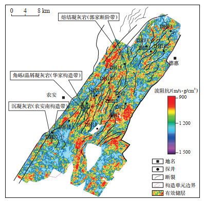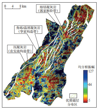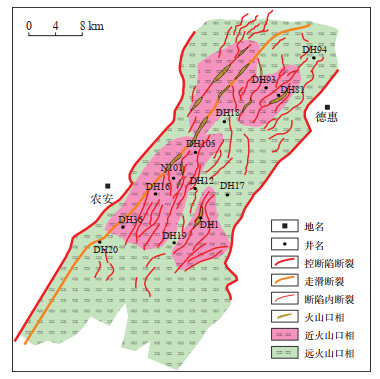 火山岩岩相是指火山岩的形成条件及其在该条件下所形成的火山岩岩性特征的总和[14]。由于火山岩所处空间位置以及形成的岩石组合存在差异,因此,不同的岩相在地震上具有不同的反射特征[15]。根据井震岩性-岩相模板,德惠断陷火山碎屑岩的物质成分不同,振幅能量也会有差异,因此利用均方根振幅属性预测优质储层的平面分布。预测分布结果(图 4)显示,凝灰岩储层分布受断裂控制明显,研究区北部郭家断阶带断距大,沿断裂发育多个火山口,因此,该地区火山口相和近火山口相发育,储层以含角砾熔结凝灰岩为主,呈块状分布;中部华家构造带断距小于郭家断阶带,火山口相不发育,整体以近火山口相为主,储层以含角砾晶屑凝灰岩沉积为主;南部的农安南构造带断裂不发育,以远火山口相为主,储层以沉凝灰岩为主,具有连片分布特征。从构造与储层配置关系来看,有利储层主要沿着构造高部位发育。结合井震岩性-岩相模板、火山喷发机制和火山岩发育程度,根据属性分析结果将德惠断陷火石岭组火山岩岩相划分为火山口相、近火山口相和远火山口相[16](图 5)。结合火山岩相带,进一步井震分析可知,火山口相或近火山口相附近凝灰岩发育,明确华家构造带和郭家断阶带是2个优质储层发育区。