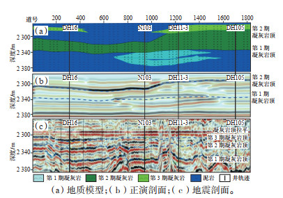 模型正演可直观认识凝灰岩内部地震反射特征,指导火山机构和岩相识别[17],通过模型正演也可明确不同期次凝灰岩旋回间的接触关系。根据凝灰岩旋回地震相特征建立正演模型,再结合测井曲线特征,模拟出地质模型(图 7),用以厘清4期凝灰岩之间的接触关系。地震剖面、正演模型和地质模型三者对应关系是一致的,为了更好地表征凝灰岩分布特征,对地震剖面进行拉平处理。地震剖面特征显示,凝灰岩内幕期次界面清楚,尤其第2期凝灰岩顶、底界面可以连续对比追踪,这与地质模型上第2期凝灰岩分布对应关系一致。地质模型显示,第2期和第3期之间有2种岩性组合模式:①2期之间有泥岩隔层,且形成强反射界面,因此,第2期沉积旋回顶界面容易识别,进而可识别出优质储层,而第3期火山岩沉积旋回呈复波特征,且横向上不连续发育;② 2期之间无泥岩隔层,2期火山岩相互叠置,导致第2期和第3期火山岩内气藏分布较为分散,有效储层位置难以准确落实。