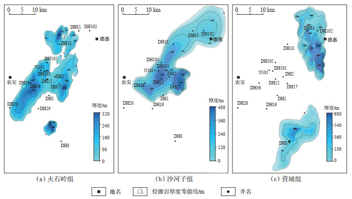 3 烃源岩分布特征松辽盆地德惠断陷烃源岩主要发育在火石岭组、沙河子组和营城组,优质烃源岩具有广覆式发育特征。钻井揭示各个时期烃源岩地层以砂泥互层沉积为主,沉积中心由南向北逐渐迁移。火石岭组沉积时期沉降中心位于南部,沉积的暗色泥岩厚度大于300 m(图 9a),TOC值为0.26%~5.08%,S1+S2为0.24~8.23 mg/g,Ro为0.6%~1.3%,烃源岩整体具有丰度高、成熟度低的特征,由南向北成熟度逐渐变高;沙河子组沉积时期沉降中心向北迁移,沉积中心在华家构造带附近,沉积的暗色泥岩累积厚度大于400 m(图 9b),TOC值为0.10%~5.55%,S1+S2为0.12~18.15 mg/g,Ro为1.1%~1.6%,烃源岩具有丰度高、成熟度中等的特征;营城组沉积末期,受构造隆升的影响,营城组遭受严重剥蚀,只在断陷东侧的控陷断裂附近残留了少量暗色泥岩(图 9c),TOC值为0.10%~9.74%,S1+S2为0.25~2.86 mg/g,Ro为1.0%~2.2%,烃源岩具有丰度高、成熟度低的特征。综上可知,火石岭组、沙河子组和营城组沉积末期的3套优质烃源岩为德惠断陷规模成藏奠定了良好的基础。
