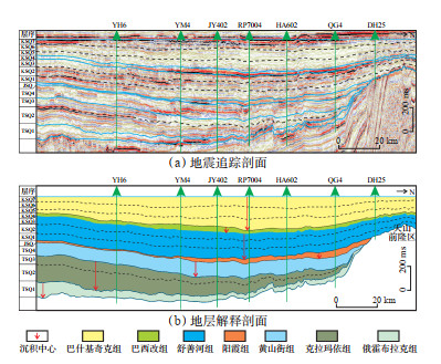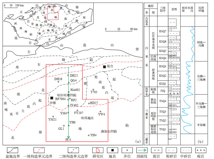 哈拉哈塘—哈得地区发育震旦系—泥盆系海相沉积地层、石炭系—二叠系海陆交互相沉积地层和中新生界陆相沉积地层[10]。研究区中生界三叠系和白垩系发育较为完整,侏罗系缺失大部分地层,其中三叠系以浅深灰色、灰黑色泥岩夹浅灰、绿灰色岩屑砂岩为主,水体相对较深,为半深湖—三角洲沉积,自下而上由俄霍布拉克组、克拉玛依组和黄山街组组成[22],依据地震反射特征及钻、测井分层可划分为TSQ1,TSQ2,TSQ3及TSQ4等4个三级层序(图 1b);侏罗系以浅灰色含砾砂岩、砂岩及灰色泥岩为主,水体深度中等,为浅湖—三角洲沉积,在研究区仅发育阳霞组,可划分为JSQ一个三级层序(图 1b);白垩系以棕褐色、灰绿色粉砂岩、棕红色粉细砂岩夹棕褐色、灰绿色泥岩为主,水体相对较浅,为浅湖—三角洲—河流沉积,自下而上由舒善河组、巴西改组和巴什基奇克组组成[4, 18, 21],依据地震反射特征及钻测井分层可划分为KSQ1,KSQ2,KSQ3,KSQ4,KSQ5,KSQ6,KSQ7等7个三级层序(图 1b)。