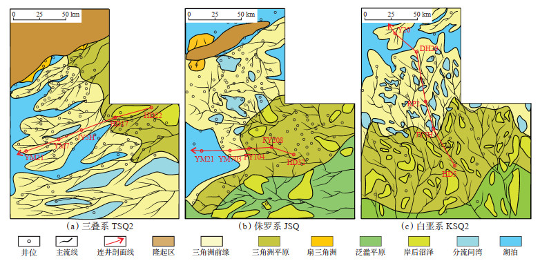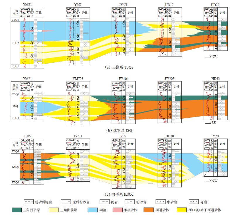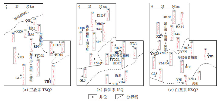 测井作为沉积相标志的一种,是识别沉积体系展布的重要依据,不同时期、不同区域具有不同的测井响应特征。三叠系TSQ2东北部区域测井曲线主要为齿化箱形,砂体呈块状,较少出现反韵律的沉积序列,表明其可能主要是河道沉积,与其平原沉积环境相一致;中南部区域测井曲线主要为漏斗形、箱形、钟形,部分层段呈指状或平直状,砂体厚度相对较小,泥岩以灰黑色、灰绿色为主,表明该区域可能为水下三角洲前缘或湖泊的沉积环境(图 6a)。侏罗系JSQ南部区域测井曲线以齿形为主,局部层段可见厚层砂岩,砂泥岩以红褐色为主,揭示了水上沉积环境的特征,可能为泛滥平原沉积;中部区域测井曲线为厚层叠置箱形,砂体呈厚层块状,少见反韵律沉积序列,表明其可能主要是河道沉积,属三角洲平原沉积环境;北部区域砂体单层厚度明显减小,但整体厚度明显增大,泥岩主要为灰绿色、灰黑色,测井曲线主要为齿化箱形、漏斗形,说明北部区域为该时期沉积中心,且为三角洲前缘水下分流河道和河口坝沉积(图 6b)。白垩系KSQ2测井响应特征与侏罗系JSQ具有相似性,但分界线略有差异,南部区域测井曲线以齿形为主,局部层段为箱形或钟形,揭示了泛滥平原河道的沉积特征;中部区域测井曲线以厚层叠置箱形为主,砂体呈厚层块状,少见漏斗形,揭示了三角洲平原支流河道的特征;北部区域测井曲线以漏斗形、箱形、钟形为主,砂岩单层厚度明显较小,反韵律沉积序列较大,反映出三角洲前缘水下分流河道和河口坝的沉积特征(图 6c)。