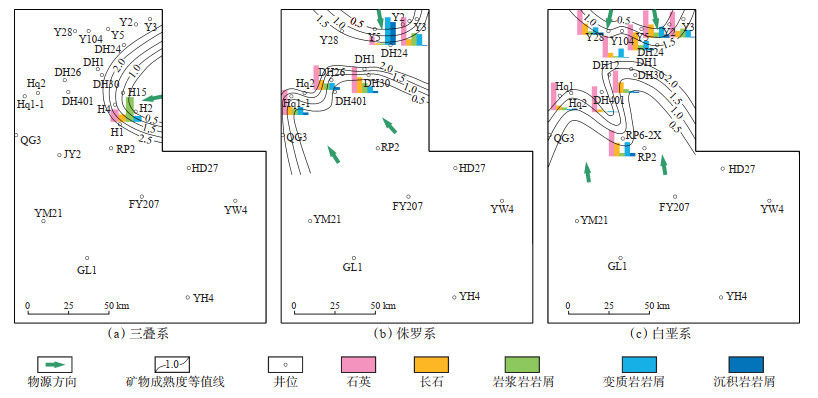 2 物源转换证据 2.1 轻矿物特征矿物之间具有严格的共生关系,通过陆源碎屑矿物组合特征及含量的变化趋势,可以追索物源方向、恢复母岩性质[23-24]。在沉积物搬运过程中,不稳定矿物成分不断减少,而稳定矿物几乎不发生变化,因此,可通过矿物成熟度(稳定矿物与不稳定矿物的比值)来指示物源方向,即石英/(长石+岩屑)。从矿物成熟度等值线图(图 2)可以看出,哈拉哈塘—哈得地区三叠系矿物成熟度由东北部向凹陷中央逐渐增大,显示该时期具有东北部1个物源区,且轻矿物组合分布特征显示,东北部区域以中高石英、低长石、高岩浆岩岩屑含量为特征,说明其母岩类型主要为岩浆岩(图 2a);侏罗系矿物成熟度由北部、东南部向凹陷中央逐渐增大,显示该时期具有北部和东南部2个物源区,且轻矿物组合分布特征显示,东南部区域以高石英、中等长石、中等岩浆岩岩屑和变质岩岩屑含量为特征,北部区域以高岩浆岩岩屑和变质岩岩屑、低长石含量为特征(图 2b);白垩系矿物成熟度由北部、南部向凹陷中央逐渐增大,显示该时期具有北部和南部2个物源区,且轻矿物组合特征(图 2c)显示,南部区域除RP6-2 X井区变质岩岩屑含量较高外,其余以高石英、中等长石、低岩屑含量为特征,北部区域以高石英、中等长石、中等岩浆岩岩屑和变质岩岩屑含量为特征。