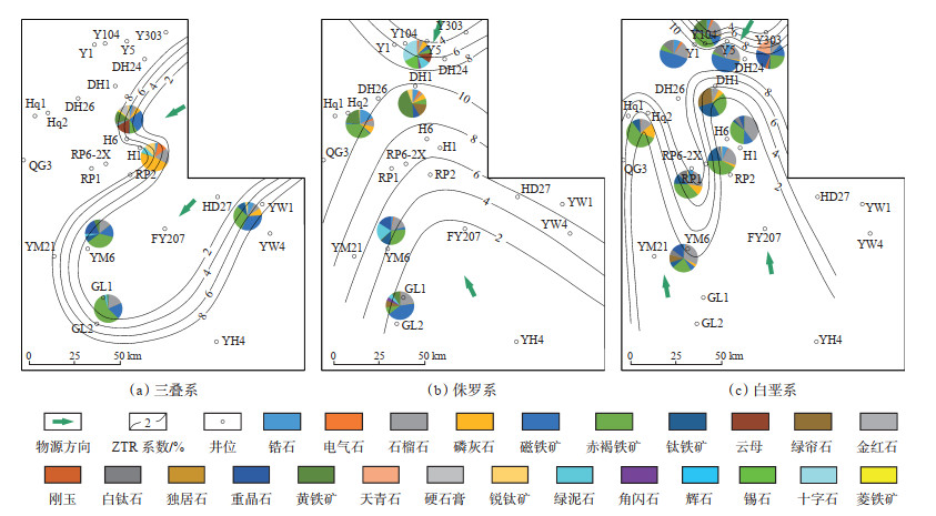 重矿物是指碎屑岩中密度大于2.86 g/cm3的碎屑矿物,通过重矿物组合特征及ZTR系数(重矿物稳定系数)的相对含量,可以判断其母岩类型及物源方向[23, 25]。从研究区ZTR系数等值线图(图 3)可以看出,三叠系ZTR系数由东北部向凹陷中央逐渐增大(图 3a),显示该时期至少有东北部1个物源区,其重矿物组合表现为赤褐铁矿+磁铁矿组合(岩浆岩)和石榴石+磷灰石+云母组合(变质岩);侏罗系ZTR系数由北部、南部向凹陷中央逐渐增大(图 3b),显示该时期发育北部和南部2个物源区,其中北部为十字石+云母+磷灰石+石榴石组合(变质岩)和磁铁矿+赤褐铁矿组合(岩浆岩),南部为黄铁矿+赤褐铁矿+磁铁矿组合(岩浆岩)和石榴石+绿帘石+重晶石+锆石组合(变质岩);白垩系ZTR系数同样由北部、南部向凹陷中央逐渐增大(图 3c),显示该时期同样发育北部和南部2个物源区,其中北部为磁铁矿+赤褐铁矿+白钛石组合(中基性岩浆岩)和石榴石+电气石+绿帘石组合(变质岩),南部为赤褐铁矿+磷灰石+钛铁矿组合(岩浆岩)和石榴石+绿帘石组合(变质岩)。