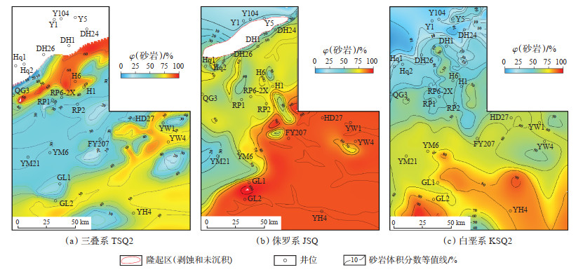 砂岩厚度和砂地比一般沿沉积走向发生规律性变化,在沉积主流线的高能相带多具有较大的砂岩厚度和较高的砂岩含量,可用于指示物源方向[23]。从研究区砂岩含量等值线图(图 4)可看出,三叠系TSQ2时期砂岩含量由北东向南西方向逐渐减少,说明该时期沉积物物源主要来自北东方向(图 4a);侏罗系JSQ时期砂岩含量由南东向北西方向逐渐减少,说明该时期沉积物物源主要来自南东方向(图 4b);白垩系KSQ2时期砂岩含量由南向北方向逐渐减少,说明白垩系时期沉积物物源主要来自南方(图 4c)。