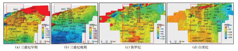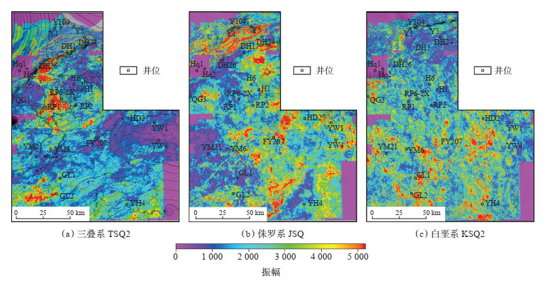 地震属性可较好地体现沉积体的结构特征,是刻画沉积相分布的一种重要的方法。研究区均方根振幅属性(图 5)显示,三叠系TSQ2均方根振幅属性结构呈北东—南西方向,且北东方向的振幅属性较强,说明该时期物源可能来自北东方向;侏罗系JSQ均方根振幅属性结构呈南东—北西方向,且南东方向的振幅属性相对较强,说明该时期物源可能来自南东方向;白垩系KSQ2均方根振幅属性结构整体都呈南—北方向(图 5c),且南部区域振幅属性相对较强,说明该时期物源主要来自南方向。