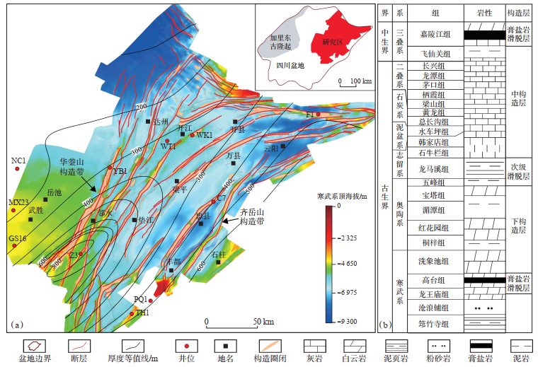 1 地质概况 1.1 地层特征四川盆地位于上扬子板块西缘,是发育在克拉通之上的含油气叠合盆地[19-20]。研究区为位于华蓥山断裂至齐岳山断裂之间呈北东走向的区域,在构造上主要表现为受基底断裂控制的隔档-隔槽式断褶带[21-23](图 1a)。研究区自下而上发育震旦系、古生界、中生界等,在垂向上表现为由寒武系高台组膏盐岩、志留系泥岩、三叠系嘉陵江组—雷口坡组膏盐岩3套区域滑脱层或软弱层控制的分层构造[1, 24]。元古界—上寒武统沧浪铺组为底部构造层,变形程度弱,表现为宣汉古隆构造背景上的多个低缓背斜褶皱带。中寒武统高台组—志留系为下构造层,高台组膏盐岩为滑脱层,上寒武统—奥陶系在冲断作用下形成冲断构造,地层变形和断裂向上消失于志留系泥岩软弱层中;泥盆系—中三叠统嘉陵江组一段为中构造层,沿志留系泥岩之上发育强烈的冲断背斜构造[25],形变较下构造层强,断裂及变形均向上消失于嘉陵江组—雷口坡组膏盐岩中(图 1b)。中三叠统—侏罗系为上构造层,表现为宽缓向斜和梳状长轴高陡断背斜[26]。滑脱层发生塑性变形,并分隔脆性变形的构造层,滑脱层上、下地层变形差异大。构造层内的脆性变形受逆冲断层调节,这些逆冲断裂普遍终止于构造层上、下的滑脱层内部,鲜有贯穿上、下滑脱层的大断层发育,仅盆缘齐岳山构造转换带的断层刺穿了高台组膏盐岩,形成基底卷入式构造,这代表了川东隔档式褶皱带的东边界[22, 24-25]。