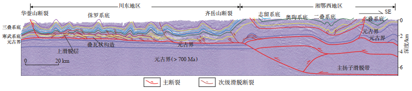 下载原图 图 2 湘鄂西—川东地区地震剖面(据文献[23]修改) Fig. 2 Seismic section of western Hunan-Hubei and eastern Sichuan Basin |