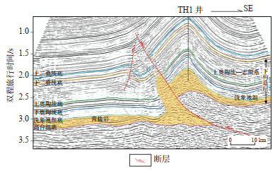 下载原图 图 3 川东地区过TH1井下构造层(中寒武统高台组—志留系)地震剖面 Fig. 3 Seismic section of lower structural layer across well TH1 in eastern Sichuan Basin |