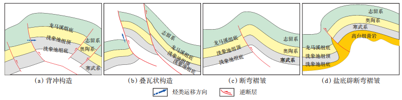 2.2 典型构造样式和圈闭结合地震、钻井等资料,在寒武系顶界洗象池组发育的128个构造圈闭中识别出背冲构造、叠瓦状构造、断弯褶皱和盐底辟断弯褶皱4种构造样式(图 4)。