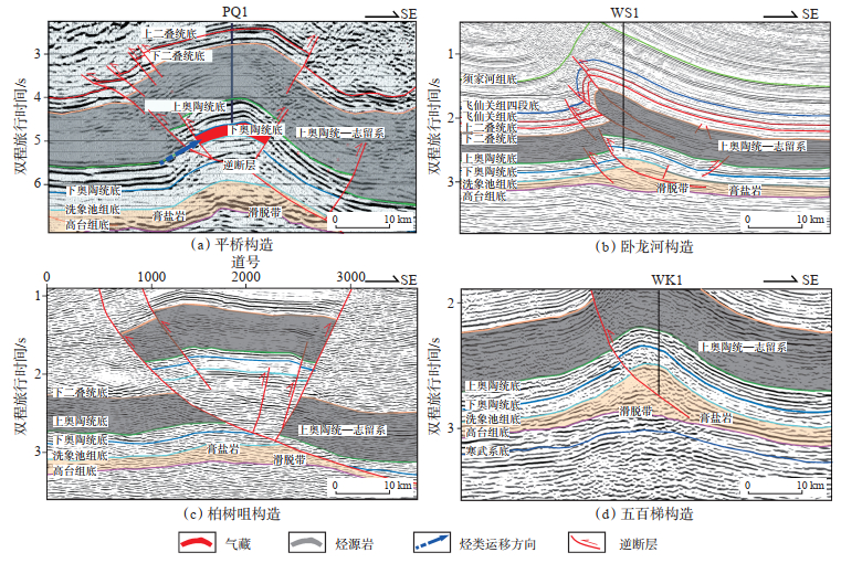(2)研究区洗象池组具备油气成藏条件,洗象池组发育成带的台内白云岩,受后期裂缝改造形成优质储层,志留系泥岩作为区域盖层具有良好的封堵条件。燕山期挤压构造逆冲不仅形成断背斜等有利的构造圈闭,而且使位于断层上盘的洗象池组与位于断层下盘的五峰组—龙马溪组烃源岩突破中—下奥陶统盖层的隔离形成源-储对接,实现油气近源水平短距离侧向运移。