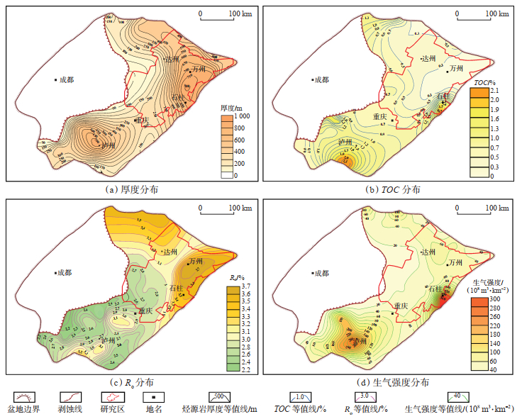 下载原图 图 6 四川盆地上奥陶统五峰组—下志留统龙马溪组烃源岩特征 Fig. 6 Contour maps for evaluating the source rocks of Upper Ordovician to Lower Silurian Longmaxi Formation in Sichuan Basin |