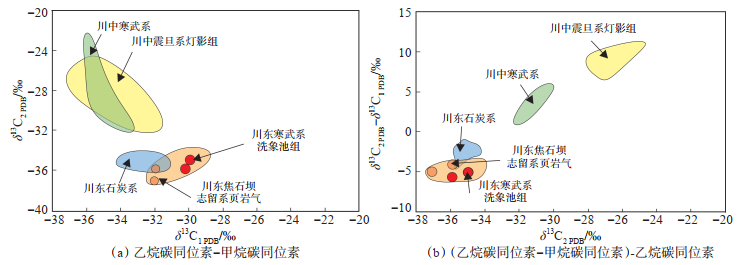 对比研究区洗象池组、石炭系、志留系(焦石坝地区),川中地区洗象池组、震旦系灯影组的天然气碳同位素特征(图 7)可知,研究区洗象池组天然气碳同位素特征与其上部石炭系,川中地区寒武系、震旦系气藏均具有明显差别[17]。