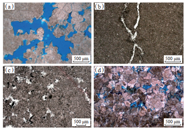 下载原图 图 8 川东地区上寒武统洗象池组白云岩储层特征 (a)砂屑粉晶白云岩,粒间扩溶及残余粒间孔,南川三汇剖面,海拔为734 m;(b)泥晶白云岩,GK1井,深度为4 435 m;(c)粉晶砂屑白云岩,粒间溶孔,沥青充填,GT2井,深度为5 320 m;(d)细—中晶白云岩,华蓥白田坝剖面,海拔为1 269 m。 Fig. 8 Characteristics of dolomite reservoirs of the Upper Cambrian Xixiangchi Formation in eastern Sichuan Basin |
