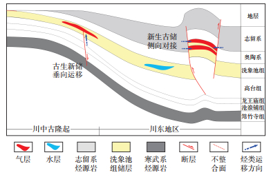 3.5 成藏模式研究区下构造层不仅具有优质烃源岩,还发育良好的规模性储层和封盖层,具备形成规模性油气藏的条件。然而,中—下奥陶统泥灰岩、高台组膏盐岩分别将五峰组—龙马溪组、筇竹寺组2套烃源岩与洗象池组分隔,阻止了烃源岩生成的油气直接运聚到洗象池组,使得洗象池组成藏条件十分苛刻。其成藏模式与川中地区以洗象池组滩相岩溶为储集层、以筇竹寺组为烃源岩、以剥蚀不整合面和断层为运移通道形成的“古生新储,垂向运移”成藏模式截然不同。