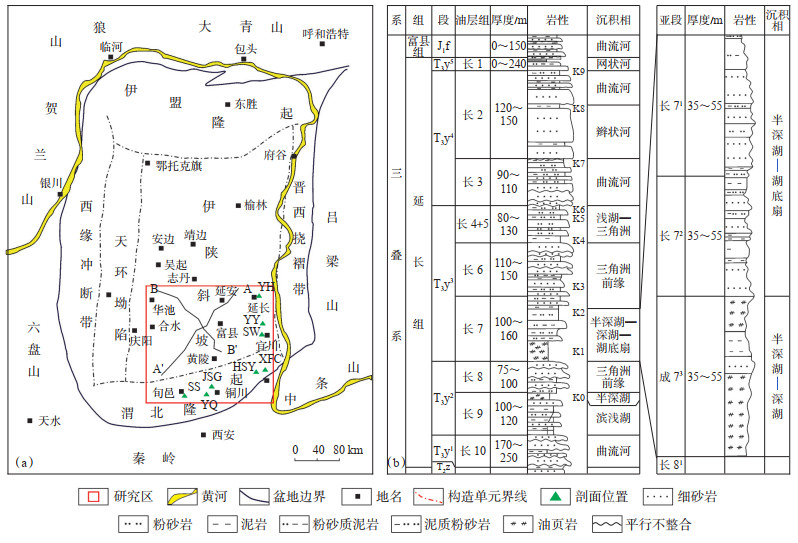 鄂尔多斯盆地可分为北部伊盟隆起、南部渭北隆起、东部晋西挠褶带、西部西缘冲断带、天环坳陷及中部的伊陕斜坡(亦称陕北斜坡)6个构造单元。研究区位于鄂尔多斯盆地东南部伊陕斜坡及部分渭北隆起(图 1a),北至延安,南至铜川,东至宜川,西至合水、华池一线,面积约4.4×104 km2。研究区有出露非常好的8个野外露头剖面:延长县延河剖面、延安市云岩河剖面、宜川县仕望河剖面、韩城市薛峰川剖面、黄龙县红石崖剖面、铜川市金锁关剖面、耀州区瑶曲剖面、旬邑县三水河剖面等(图 1a)。同时研究区有钻穿长7油层组的300余口钻井,为盆地东南部长7油层组沉积演化规律研究提供了保障。