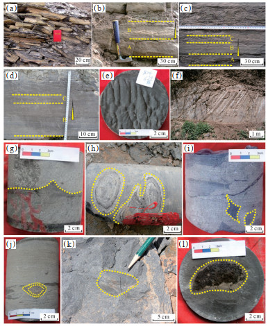 鄂尔多斯盆地东南部三叠系长7油层组发育有多种深水沉积构造,包括深水、静水悬移沉积构造及多种深水重力流构造。①水平层理:深灰色/灰黑色页岩、泥岩,连续几十米发育水平层理,反映稳定连续的低能还原环境(图 2a),研究区发育的深灰色泥岩、炭质页岩、油页岩是半深湖—深湖相沉积的重要标志。②鲍马序列:该构造序列以灰色和深灰色细砂岩、粉砂岩组成的鲍马序列AB段(图 2b)、ABC段(图 2c)、BC段(图 2d)不完整组合,A段是因重力分异作用形成的正粒序砂岩,B段为牵引流成因的平行层理,C段为牵引流成因的沙纹层理,鲍马序列是浊流沉积存在的直接标志。③槽模、沟模:通常为重力流底面印模构造,虽然不是重力流沉积的独有产物,但却是判断重力流最明显的标志,由于重力流流体在下伏未固结泥质沉积物上冲刷后期印模所形成的,在研究区最多见的是槽模(图 2e)、沟模(图 2f)。④滑动与滑塌构造:滑动构造表现为灰色厚层块状砂岩,无其他沉积构造,底面见火焰状构造(图 2g),由砂质块体向前滑动,底部泥岩呈火焰状向上侵入砂体内部所形成。滑塌构造表现为灰色厚层块状砂岩,内部砂球构造、包卷层理构造、变形层理等同生变形构造,砂球构造外貌呈椭球状或枕状,砂球构造内部是细砂岩、粉砂岩,外部是粉砂质泥岩,由于沉积物沿着滑动面运移,经历旋转变形而造成了内部形变(图 2h)。⑤撕裂屑、泥包砾:该构造为灰色厚层块状砂岩夹漂浮的撕裂屑(图 2i)和泥包砾结构(图 2j),漂浮泥屑由浮力支撑,泥包砾结构表现为砾石外包有一层泥岩外套,是砂质碎屑流侵蚀下伏未固结泥质沉积物而被包裹悬浮搬运沉积而形成的,有学者认为泥包砾构造是砂质碎屑流沉积的直接鉴别标志[32]