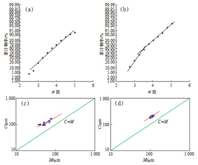 下载原图 图 3 鄂尔多斯盆地东南部三叠系长7油层组碎屑颗粒概率累计曲线及C-M (a)碎屑颗粒概率累计曲线,新43井,长72,1 044.97 m;(b)碎屑颗粒概率累计曲线,富西6井,长72,1 104.03 m;(c)C-M图,新43井;(d)C-M图,富西6井。 Fig. 3 Probability cumulative curve and C-M diagram of debris particles of Triassic Chang 7 reservoir in southeastern Ordos Basin