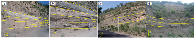 下载原图 图 5 鄂尔多斯盆地东南部三叠系长7油层组湖底扇野外露头 (a)—(b)重力流主水道微相及上部溢流沉积微相,旬邑三水河剖面;(c)重力流分支水道微相,旬邑三水河剖面;(d)朵叶体微相,铜川聂家山剖面。 Fig. 5 Outcrops of sublacustrine fan of Triassic Chang 7 reservoir in southeastern Ordos Basin